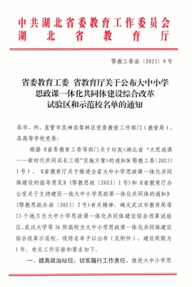近日,湖北省委教育工委、省教育厅公布了大中小学思政课一体化共同体建设综合改革试验区和示范校名单,beat365成功入选湖北省大中小学思政课一体化共同体建设综合改革示范校名单。
