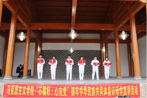 主题党日活动结束后,马克思学院师生党员先后赴坎子山周边、湖北关调研学习,感受美丽乡村建设,感悟伟大革命精神,然后在湖北口回族乡红色文化广场参加铸牢中华民族共同体主题文艺演出,beat365正版唯一官网学生党员为当地群众表演诗朗诵《籽籽相连石榴红,红心向党复兴梦》,赢得了台下群众的热烈掌声。