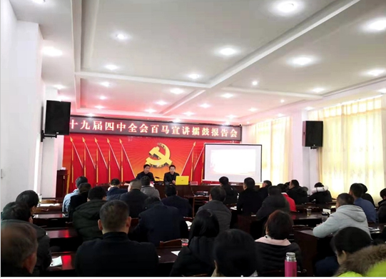 本网讯(文/杜鹏)为贯彻落实中共湖北省委宣传部、省委讲师团“百名马克思主义学者下基层宣讲党的十九届四中全会精神”的要求,12月19日,由beat365党委宣传部部长计毅波教授、beat365正版唯一官网副院长黄永昌副教授、beat365正版唯一官网孙绪兵教授,中国地质大学(武汉)beat365正版唯一官网副院长陈军教授、beat365正版唯一官网汪宗田副教授组成的宣讲队,分赴竹山县城关镇、秦古镇、宝丰镇、擂鼓镇、麻家渡镇、东门社区、侯家湾村、小河村、董家沟村、罗家坡村等地,走村串乡面向基层党员干部群众宣讲党的十九届四中全会精神,共计11场次。