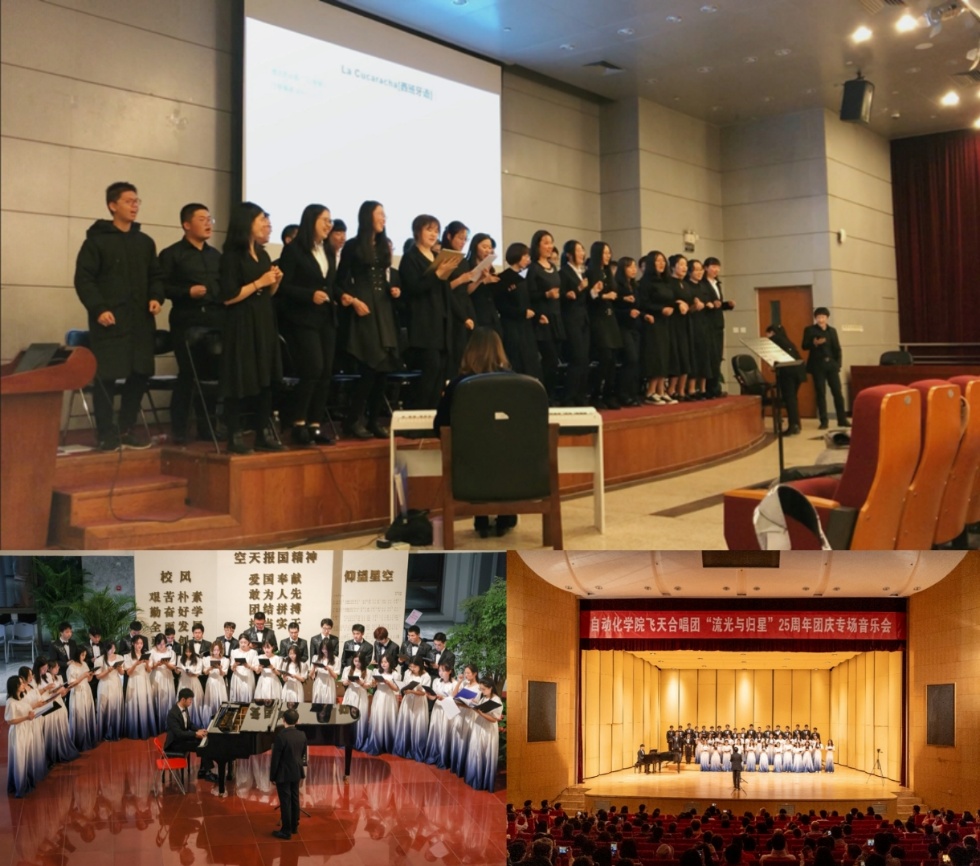 自1998年由学院学子自发创建以来,飞天艺术团始终坚持以艺育人、以文化人,历代团员秉承“弦歌不辍守初心、艺心向党担使命”的信念,铸就了以“空天报国、追求卓越”为核心的“飞天精神”。这种精神,在艺术团下属合唱团的团歌《蓝天之梦》中得以具象化呈现——“用青春和理想战胜迷惘,把我们的自信写在万里蓝天,让我蓝天的梦想为我的青春导航,让我似火的激情为我插上高飞翅膀。”这首由2000级学子作词、常任指挥王程老师编曲的团歌,正是自动化学子理想信念的生动写照,成为激励历代团员传承红色基因、矢志科技报国的精神符号。